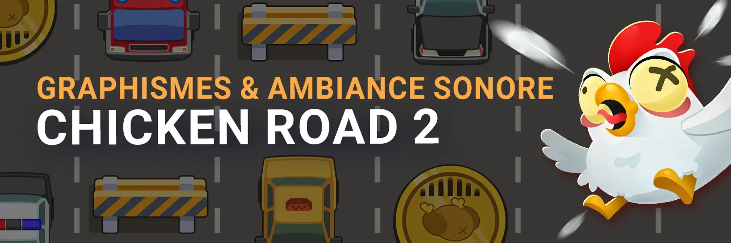 Le jeu adopte un style cartoon/arcade avec des couleurs vives, des contours nets et des animations fluides lorsque la poule avance sur les voies. Les multiplicateurs sont bien visibles et mis en valeur par de subtils effets lumineux. La scène de jeu (routes, bordures, bouches d’égout et véhicules) apporte du rythme sans surcharger l’écran, tandis que l’interface reste sobre et fonctionnelle.